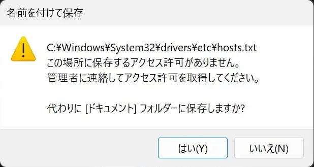 この画像は、hostsファイルの編集内容を保存する際に、管理者権限がないために表示されるエラーメッセージです。