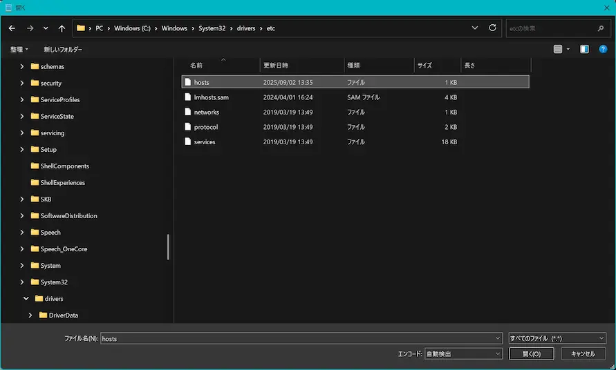 4. hostsファイルを開く:管理者権限で起動したメモ帳の「ファイル」メニューから「開く」を選択し、以下のパスにあるhostsファイルを開きます。C:\Windows\System32\drivers\etc\hosts