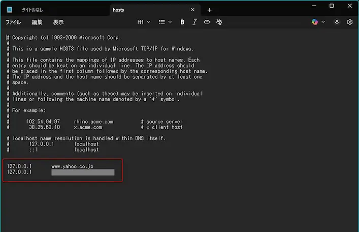 • 127.0.0.1 www.yahoo.co.jp:Yahoo Japanへのアクセスを、自分自身のPC(127.0.0.1)に転送してブロックする設定です。