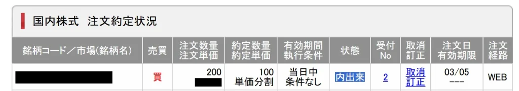 - 現在の状態: まだ100株分しか買えておらず、残りの100株については引き続き市場で買い注文が出たまま、相手(売り手)を待っている状態です。